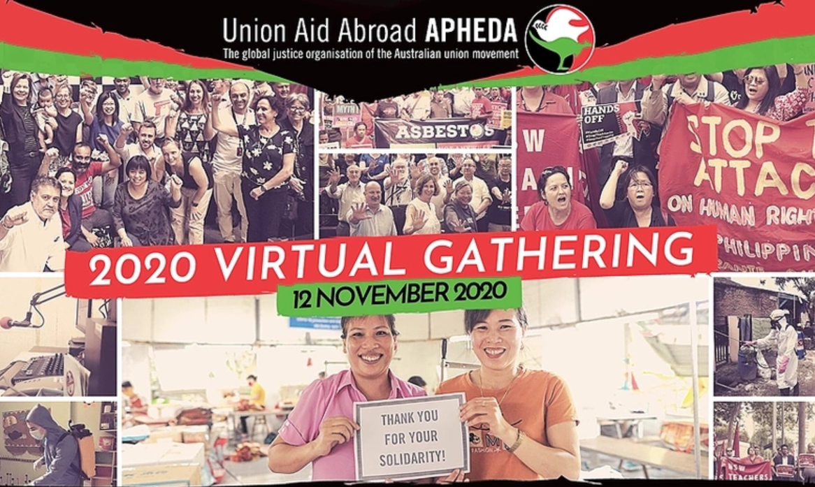 Union Aid Abroad-APHEDA Virtual GatheringThe time has come again to support global solidarity by joining Union Aid Abroad-APHEDA at this year’s annual celebration. In place of a physical gathering, this year we are asking you to join virtually as we come together across Australia, and globally, to celebrate the achievements from the past 12 months. Joining APHEDA this year will be General Secretary of the International Trade Union Confederation (ITUC), Sharan Burrow. Thursday 12th Nov 2020, 7:00 pm – 9:00 pm AEDT |