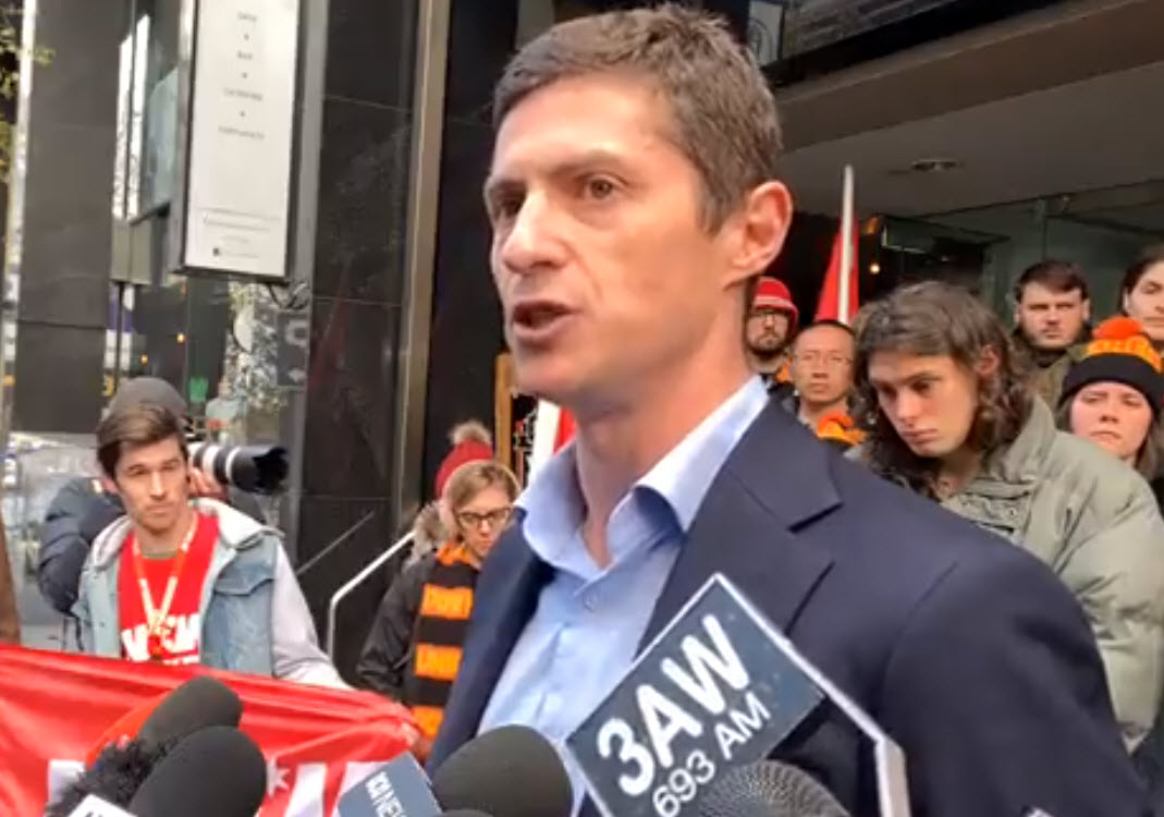 Photo: ACTU Assistant Secretary Liam O’Brien speaking outside the FWC in Melbourne |