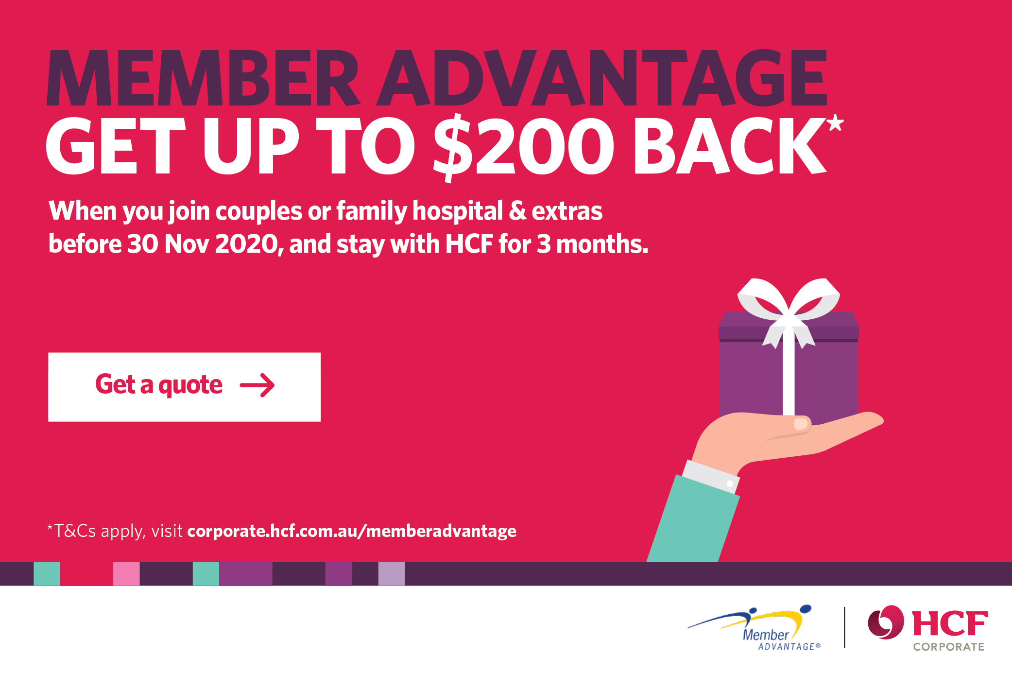 Save on health insurance with Member AdvantageMember Advantage has partnered with HCF, Australia’s most-trusted health fund*, to provide you with cover you can count on. They’re not your typical health fund – they genuinely want you to get great value cover. That’s why you’ll also receive $100 cash back for singles or $200 for family/couples, when you join hospital & extras cover before 30 Nov 2020, and stay for three months. And as a Member Advantage corporate member, you’ll have access to exclusive products with more benefits compared to our standard HCF cover: