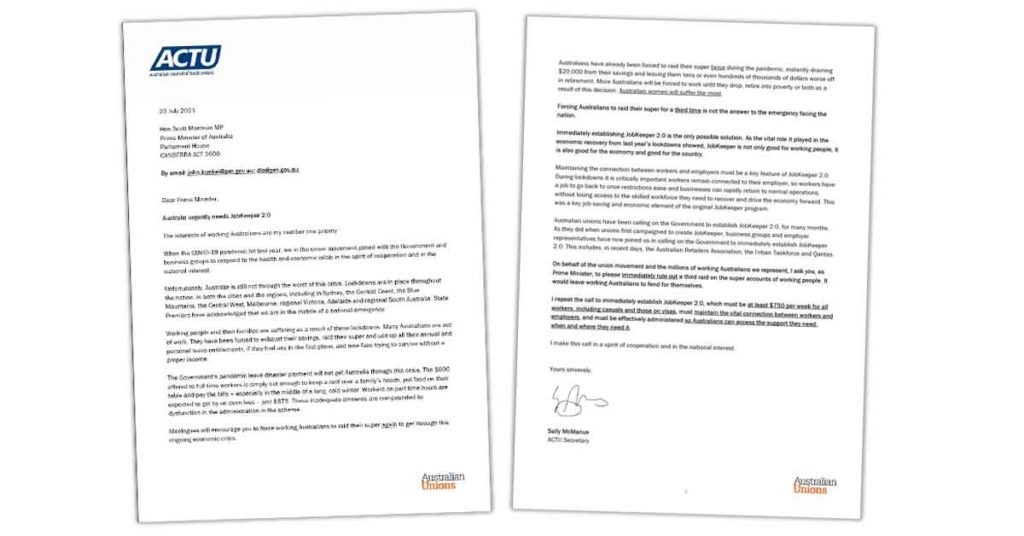 On Friday, ACTU Secretary Sally McManus wrote to Prime Minister Scott Morrison, calling on the Federal Government to immediately instate JobKeeper 2.0.