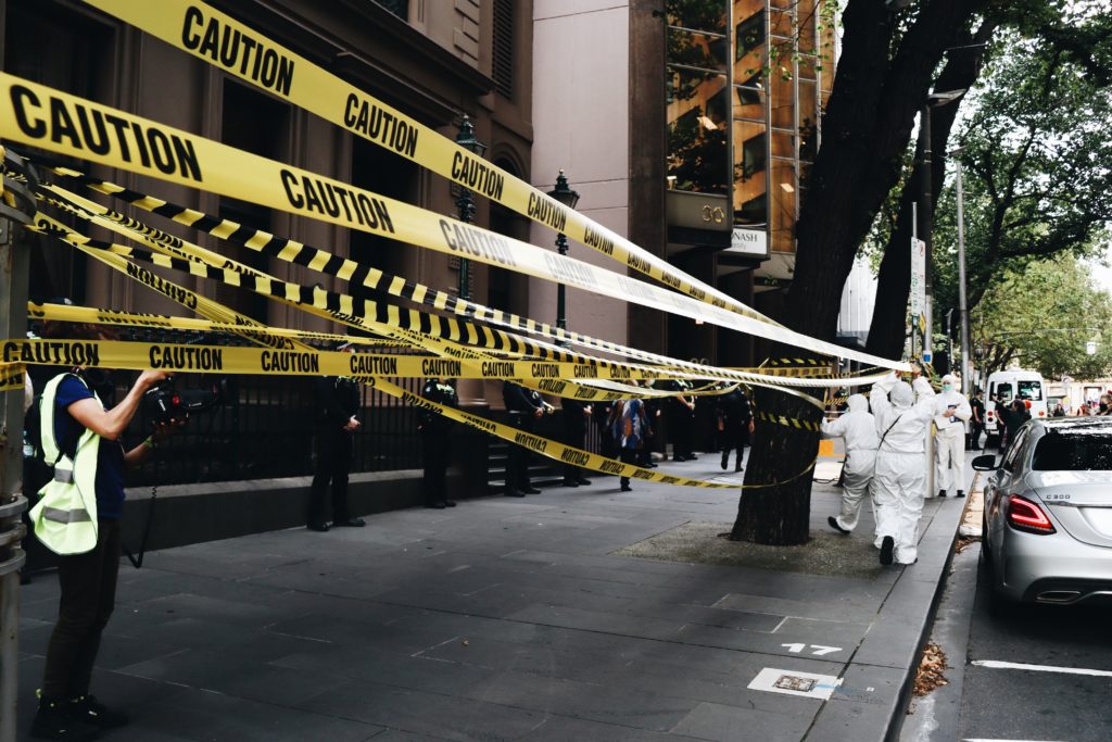 Individuals in white hazmat suits burst from the crowd and rolled out rows of yellow caution tape between trees and bannisters in front of the club.