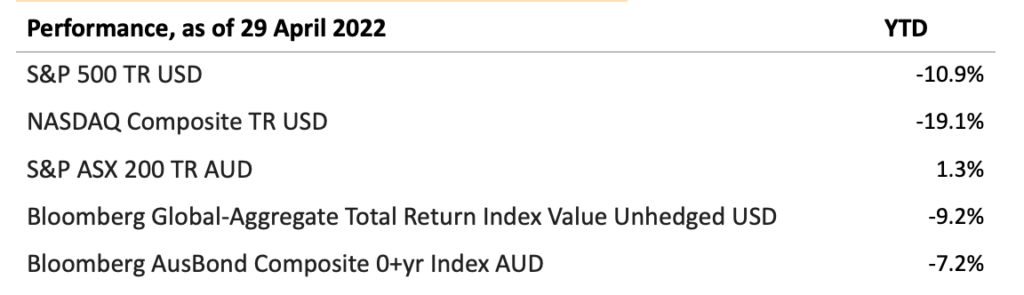 Major Indices Year to Date Performance as of 29 April, 2022