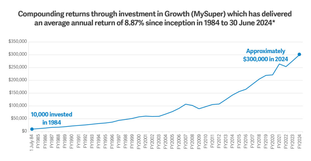*The Growth (MySuper) option has delivered an average annual return of 8.87% since inception in 1984 to 30 June 2024. This example is for illustration purposes only. Balances have been calculated using financial year returns compounding annually. Investment performance is based on the crediting rate, which is the return minus investment fees, taxes, and until 31 January 2020, the percentage-based administration fee. Excludes fees and costs that are deducted directly from members’ accounts. Past performance is not a reliable indicator of future performance. Media Super merged with Cbus on 9 April 2022. The historical performance prior to this date relates to Cbus investment options and does not incorporate the performance of Media Super.