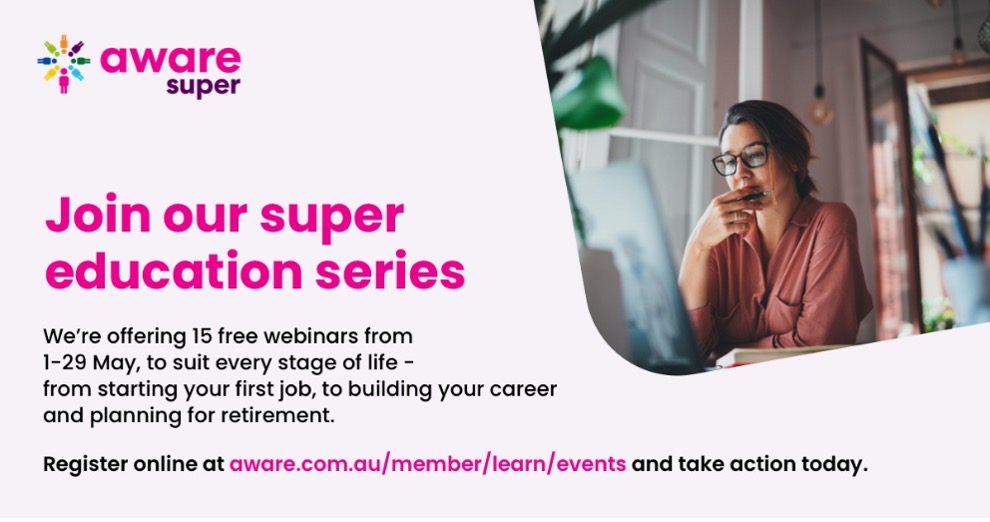 Running from 1 to 29 May, join Aware Super’s complimentary Superannuation Education webinar series, featuring 15 sessions on topics including building better money habits, Super 101, retirement planning, Insurance 101 and more.