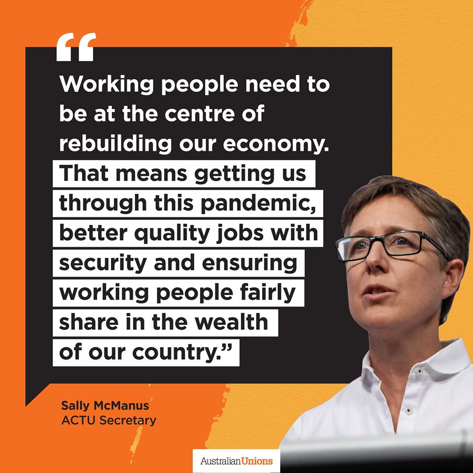 ACTU will focus on building a better, stronger and fairer AustraliaThe peak body for working people, the Australian Council of Trade Unions, welcomes the opportunity to sit down with the Government and employers to discuss how our economy can be rebuilt as flagged by Prime Minister, Scott Morrison at his recent national press club speech. The ACTU also welcomed the withdrawal of the Ensuring Integrity legislation – a law which unions and many legal experts say was a direct attack on the democratic rights of workers. The ACTU called on the government to ensure that the recovery strengthens the rights of all working people, and reiterated that attacks on working people, whether from business lobbyists or governments, were not compatible with a cooperative approach to rebuilding Australia. ACTU Secretary, Sally McManus said, “Australian Unions will not lose our focus on the immediate challenge to stop a second wave of infections. This is our first job, otherwise the pain and sacrifices working people have made, with 20 per cent of working people now unemployed or underemployed and so many losing income, will be for nothing.” |